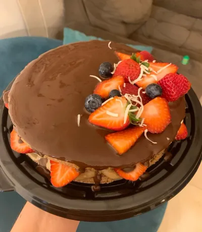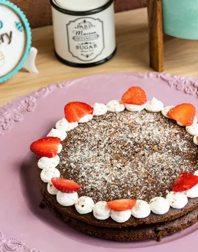 Pastel de chocolate amargo con relleno de crema vegetal, decorado con fresas.