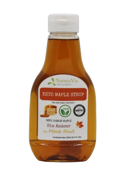 Jarabe de Fruta del Monje sabor maple sin azúcar ¡delicioso sabor!, sugar-Free Keto Maple Syrup, Ingredientes: agua purificada, eritritol (endulzante natural), extracto de vainilla, sabor maple natural y artificial, glicerina, fibra de celulosa, goma Xantana, extracto puro de stevia, extracto puro de fruta del monje 25% mogrósidos, benzoato de sodio.